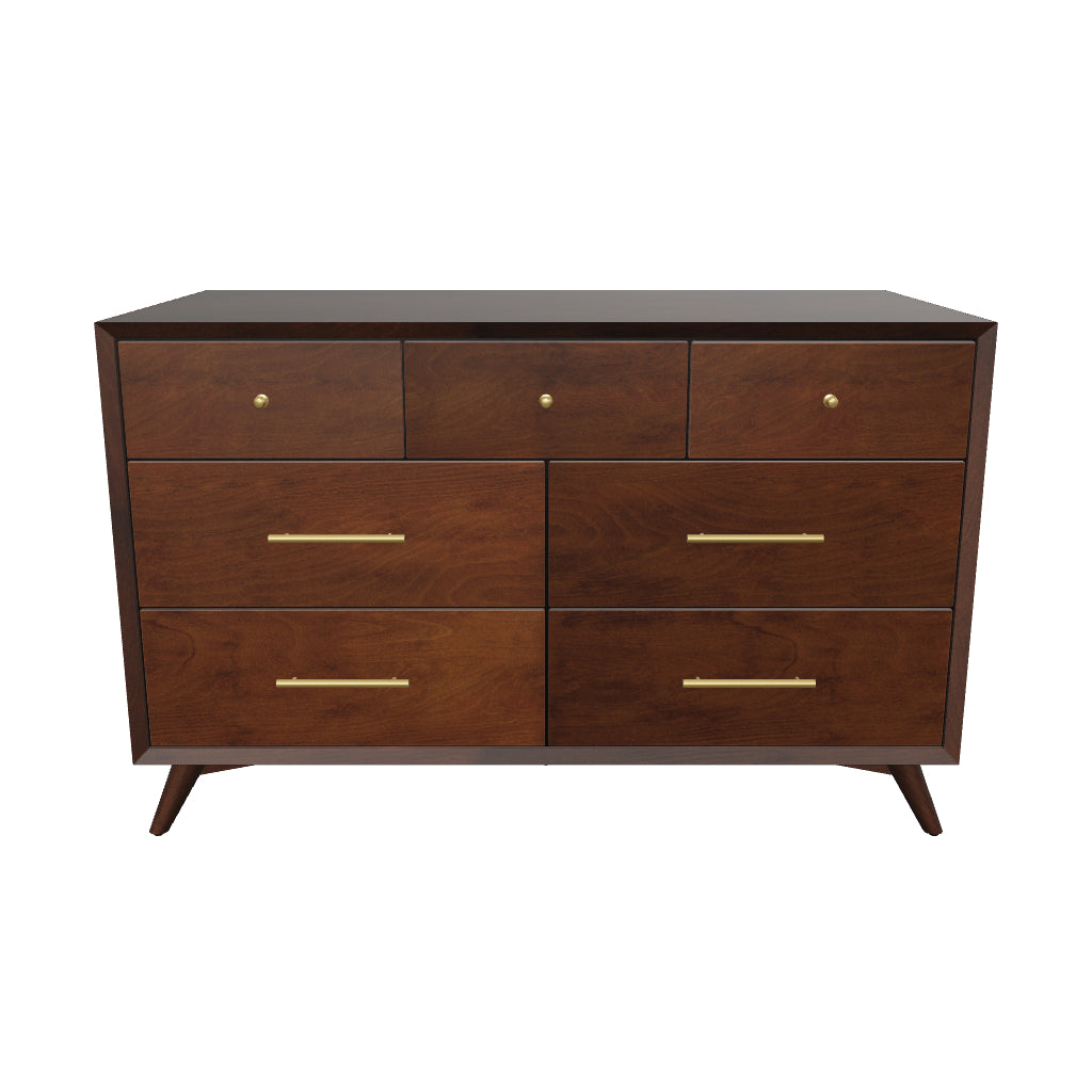 The Flynn collection features the classic lines of Mid-Century Modern furniture that never goes out of style. Its sturdy frames are built to last, constructed of sustainably sourced solid Mahogany to ensure a lifetime of use. The Flynn dresser has seven drawers to accommodate most bedroom necessities. The dresser comes fully assembled, and is constructed with ball bearing metal drawer glides and French & English dovetail drawer construction. The Flynn bedroom makes it easy to create a cohesive decorating style or mix and match for a more personalized look. Coordinates with other pieces in multiple finish options as part of the Alpine Furniture Flynn collection sold separately.