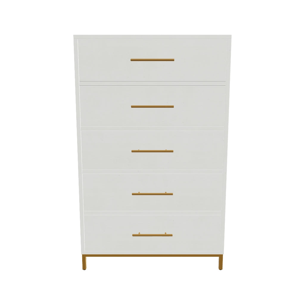 Add modern flair to your bedroom with the Madelyn White 5-Drawer Chest. Providing storage for your essentials, this piece is crafted from sustainably sourced Mahogany. Features include a felt-lined top drawer, English dovetail construction and metal ball bearing drawer glides. The clean lines and beautiful finish blend effortlessly in any decorating scheme. Coordinates with other pieces in the Alpine Furniture Madelyn bedroom collection sold separately.