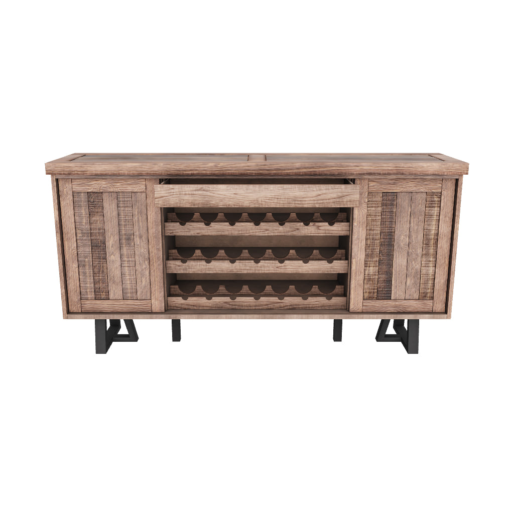 With a beautiful natural/black distressed salvaged wood finish, bring rustic elegance to your dining room with the Prairie Dining sideboard. Using sustainable wood resources, this sideboard is constructed with Acacia wood and built with angled legs with an x-design at its base for both aesthetic appeal and stability. Designed with hosting in mind, this sideboard provides storage for dishware and wine bottles and is styled well with a combination of a table, bench and dining chairs sold separately.