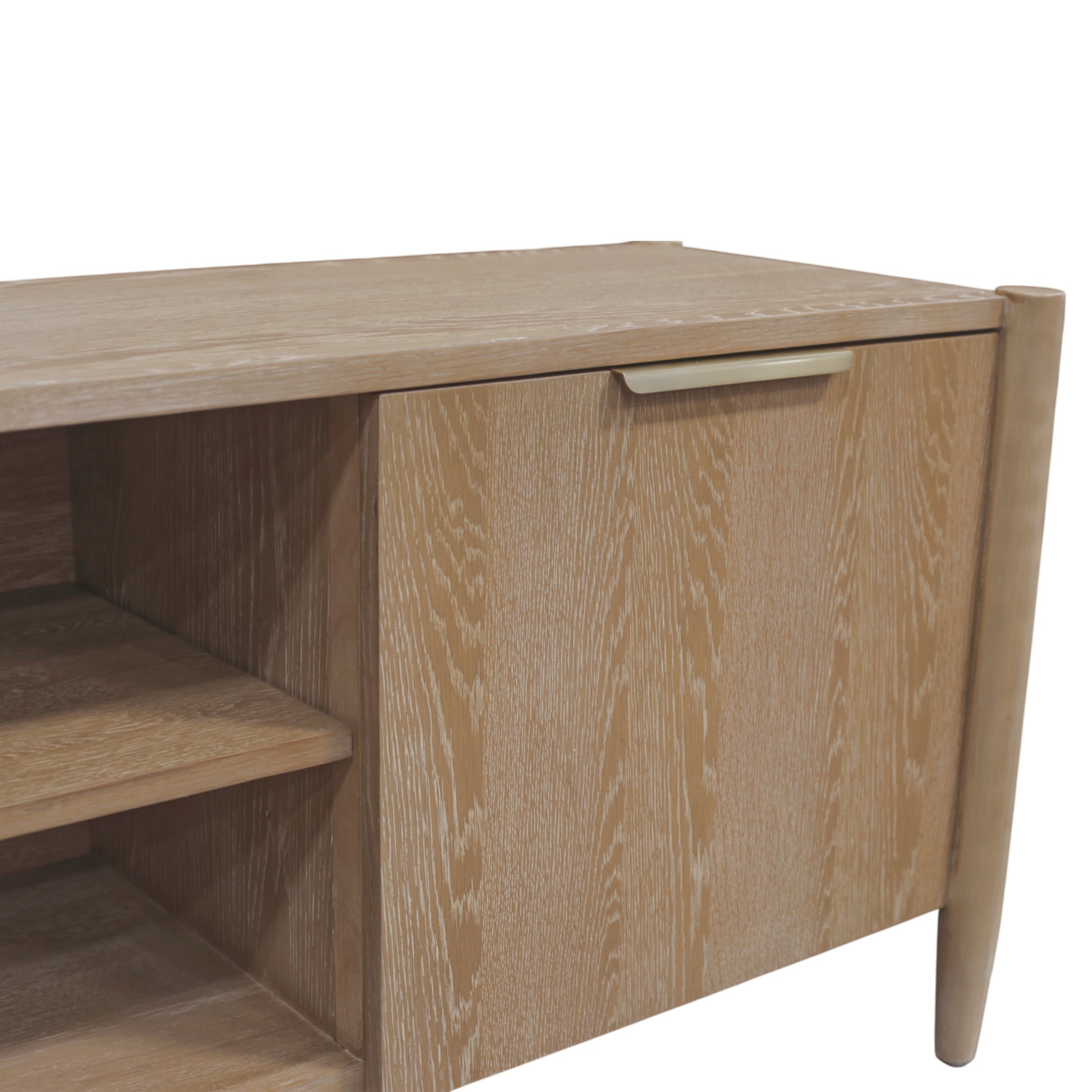 Elevate your entertainment space with the Sinclair TV Console — a sleek blend of modern function and timeless craftsmanship. Available in your choice of a warm Walnut or breezy Natural finish, this piece is crafted from solid rubberwood with Oak veneer for lasting durability and beauty. The streamlined silhouette, tapered legs, and clean lines make it a versatile centerpiece that complements any décor style. With ample closed storage, an adjustable center shelf, and a cable management hole for seamless organization, the Sinclair brings both style and simplicity to your living room.